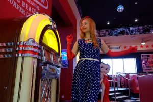 “Look! There’s a jukebox!” said Donna. She got up from the restaurant table she was sitting at with her friends and went over to take a look at a large, old jukebox from the 1950s. Inside the wooden cabinet she could see a stack of 45 rpm vinyl records. Surrounding the front of the jukebox were orange and yellow lights.