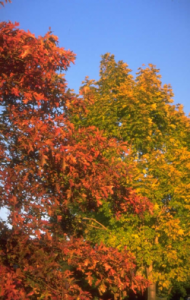 During the fall, the leaves on the trees turn from green to gold, yellow, orange, brown or red. These are fall colors. Some trees, such as spruce and pine trees, remain green throughout the year. To see so many different colors on all of the trees at one time is what makes the fall such a beautiful time of year.